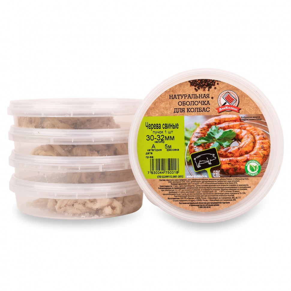 Натуральная оболочка свиная 30-32 мм — один из самых узких калибров свиной черевы, отлично подходит для приготовления колбасок для жарки, так как тонкие изделия быстрее прожариваются. Такой вид черевы так же используют для приготовления тонких сыровяленых и сырокопченых колбасок. После термической обработки продукта - оболочку чаще всего употребляют с получившимся колбасным изделием.
