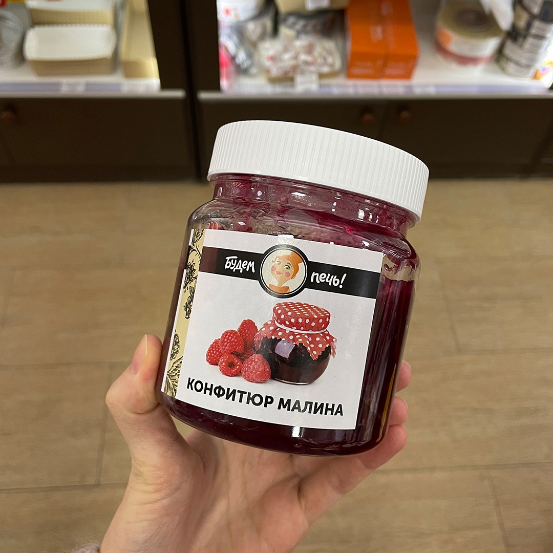 Состав: малина, сахар-песок, патока, загустители (Е1442 крахмал, Е440 пектин), регулятор кислотности, ароматизатор "Малина", сорбат калия, краситель (Е124 понсо 4R), вода очищенная.